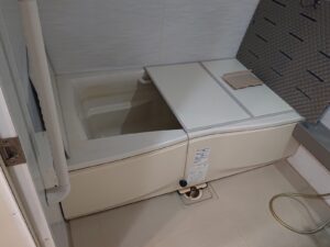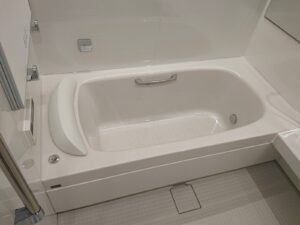 FRP素材の浴槽、ゴム排水栓、四角い形状の浴槽でした。