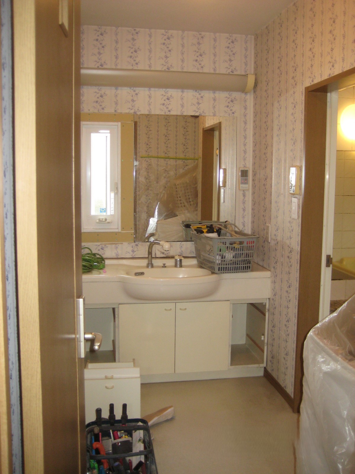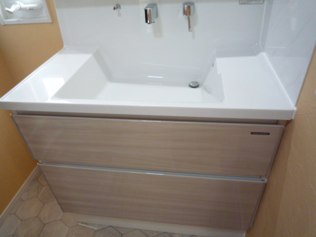 幅の広い洗面台から幅900mmサイズに取替、横の隙間にはワゴンを置くという方式にされました。