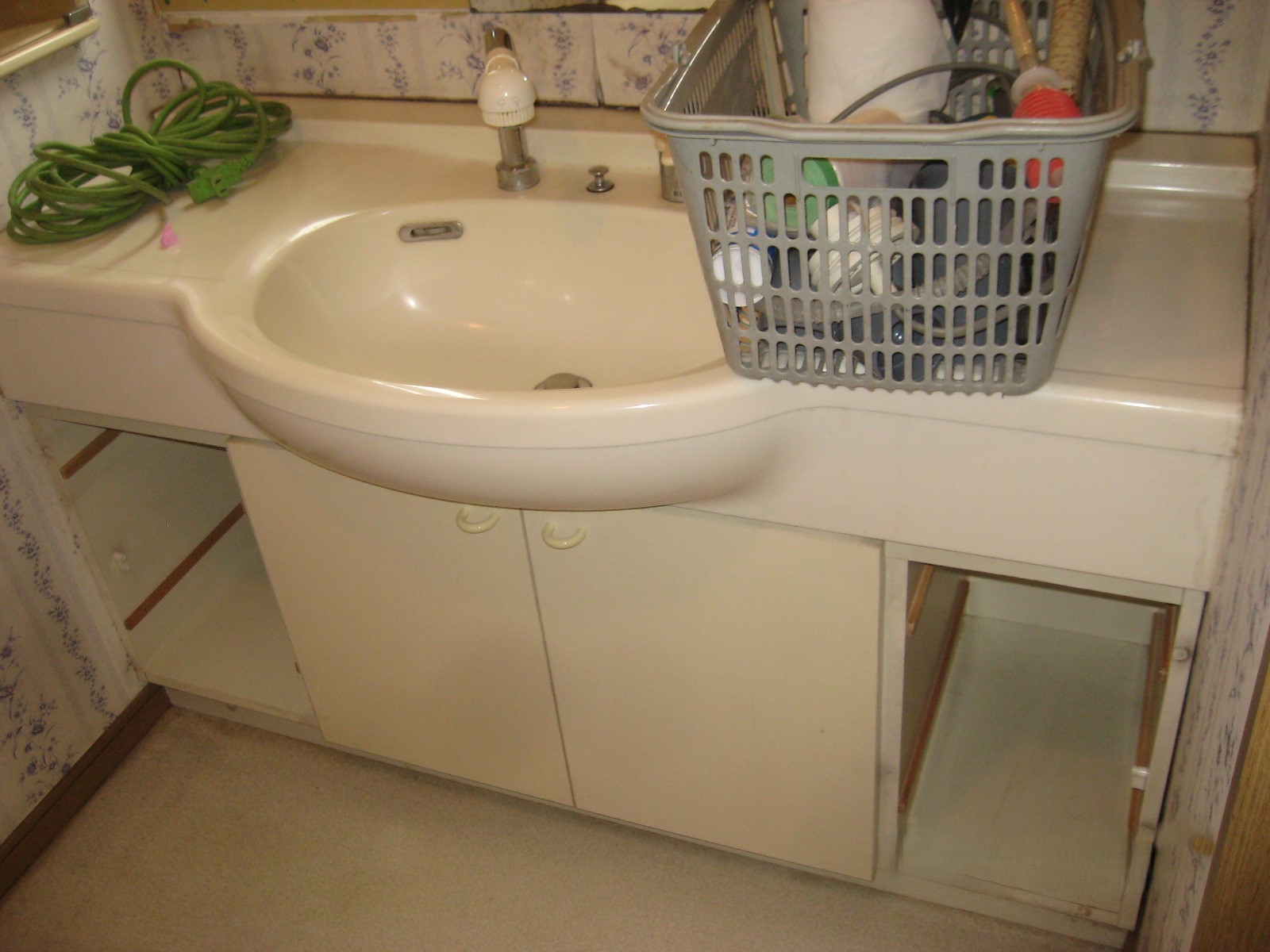 もともとの洗面下台の様子です。洗面台から水栓金具(蛇口)が立ち上がっているタイプでした。