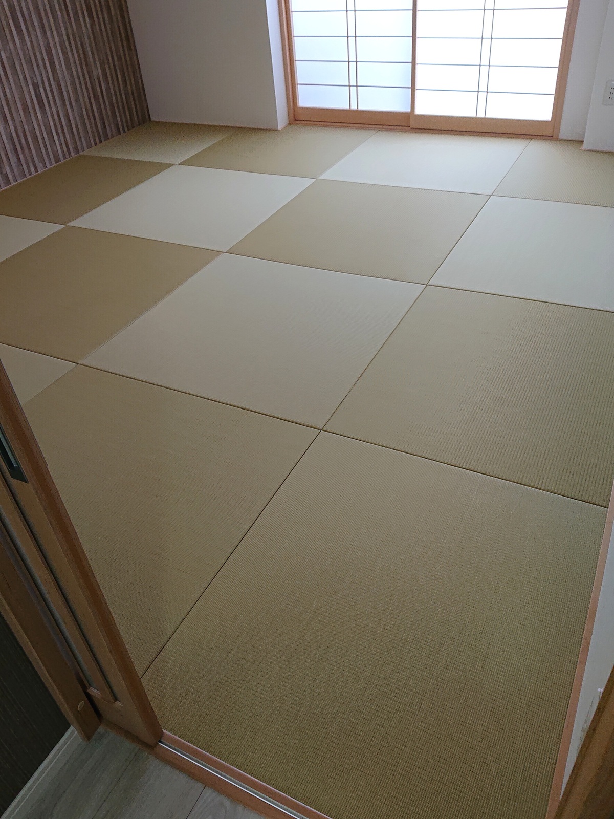 琉球畳風デザインの床材にしました。採用したのは大建工業(DAIKEN)の「ここち和座」です。