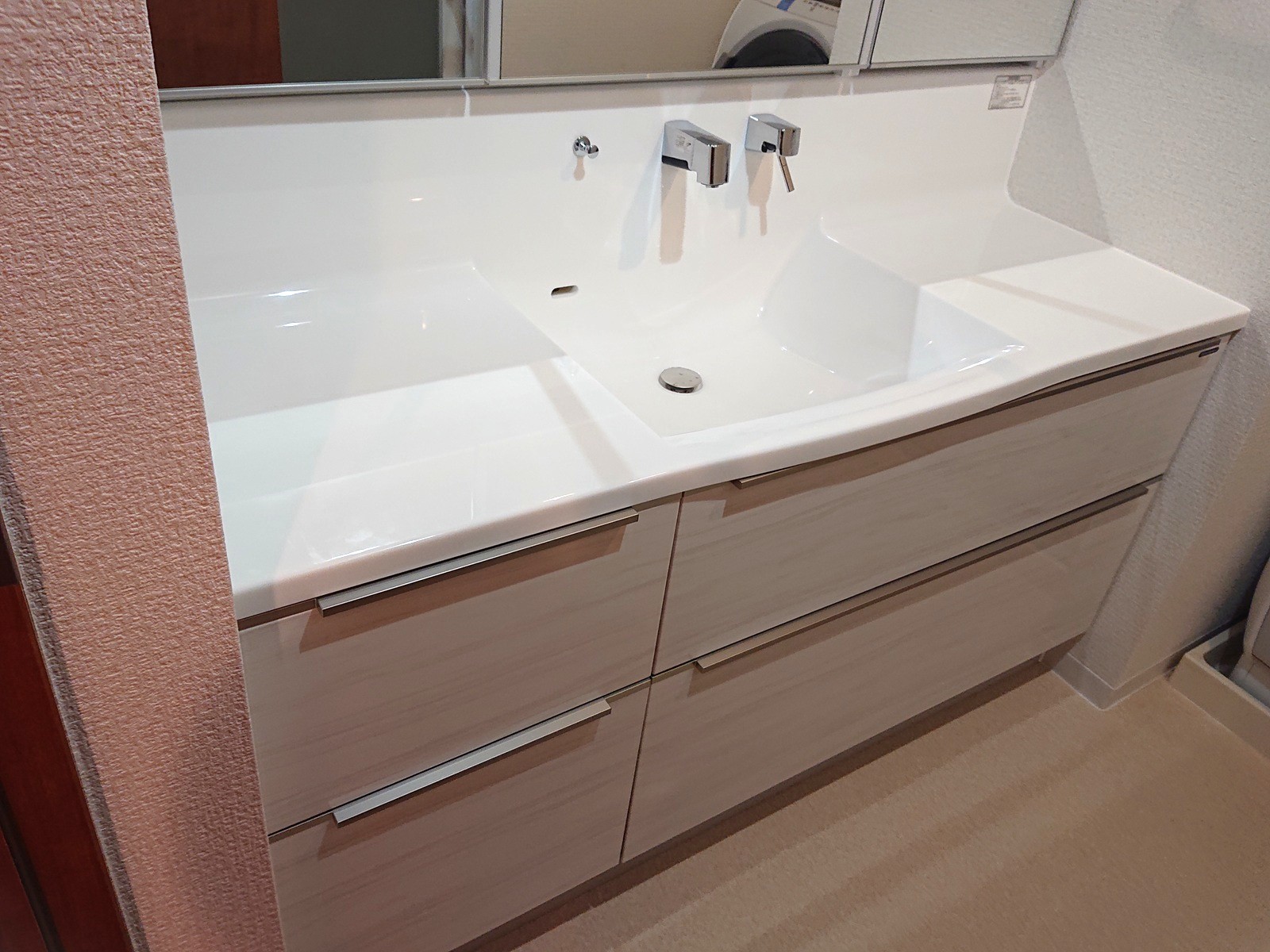 もともとの洗面台は、幅1500mmサイズでした。壁から壁までの幅が広い洗面台です。